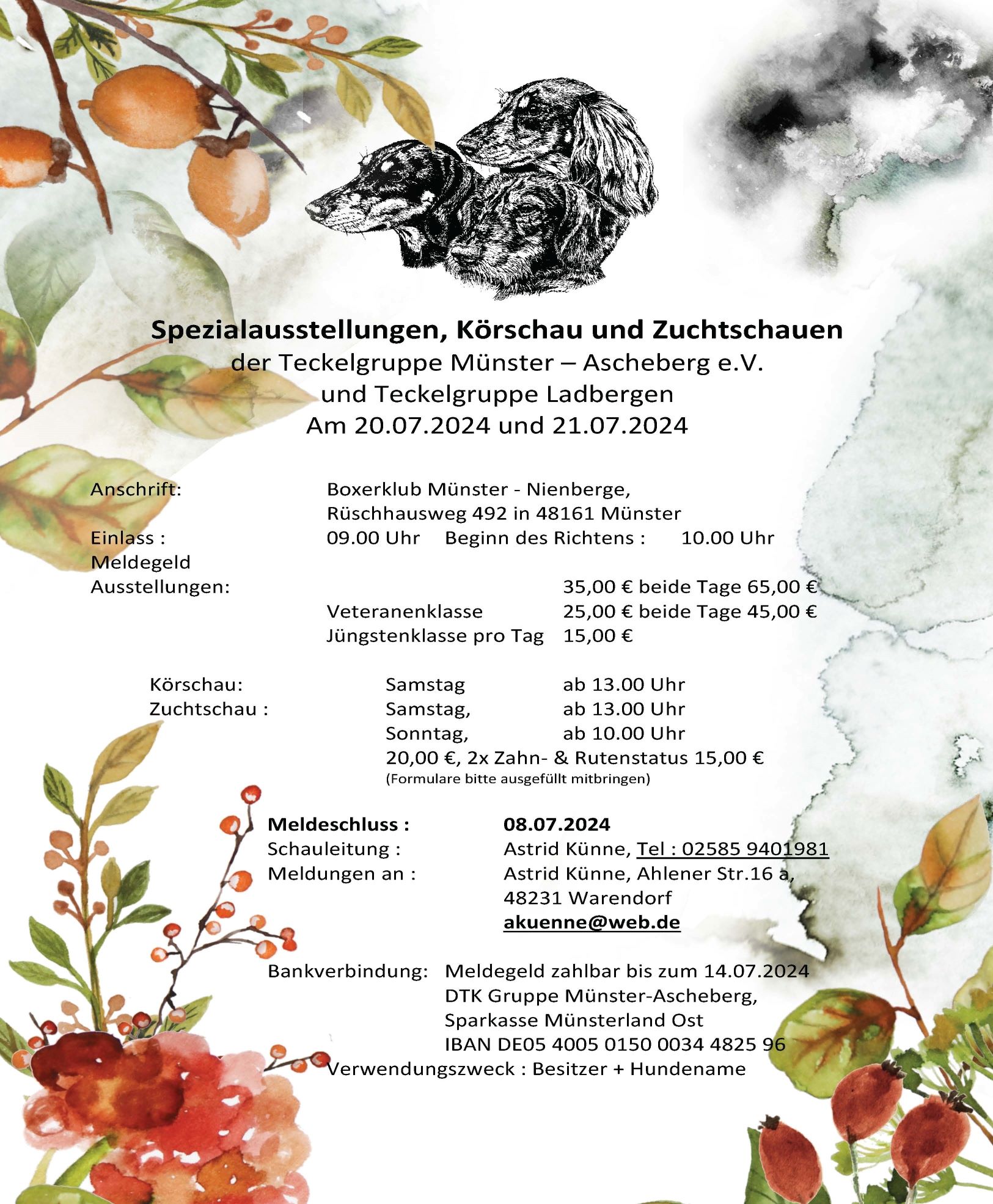 Es ist wieder soweit ! Die Teckelgruppen Ladbergen und Münster-Ascheberg freuen sich auf ein gemeinsames Ausstellungswochenende mit vielen netten Begegnungen am 20.07.24 und 21.07.2024. 20.07.2024 Spezialausstellung Gruppe MS-Ascheberg und Zuchtschau der Gruppe Ladbergen Körzuchtschau Gruppe MS-Ascheberg Richter: Frau Doris Vetsch (Rauhaarteckel) und Herr Georg Lang (Kurz- und Langhaarteckel) 21.07.2024 Spezialausstellung Gruppe Ladbergen / Zuchtschau Gruppe…